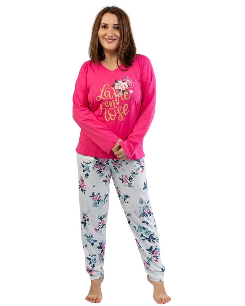 Elegantní dámské pyžamo dlouhé Rose. Dámské pyžamo má dlouhé rukávy a motiv květiny, kalhoty jsou rovněž dlouhé s potiskem. Materiál: triko 100% bavlna, kalhoty 70% bavlna 30% polyester