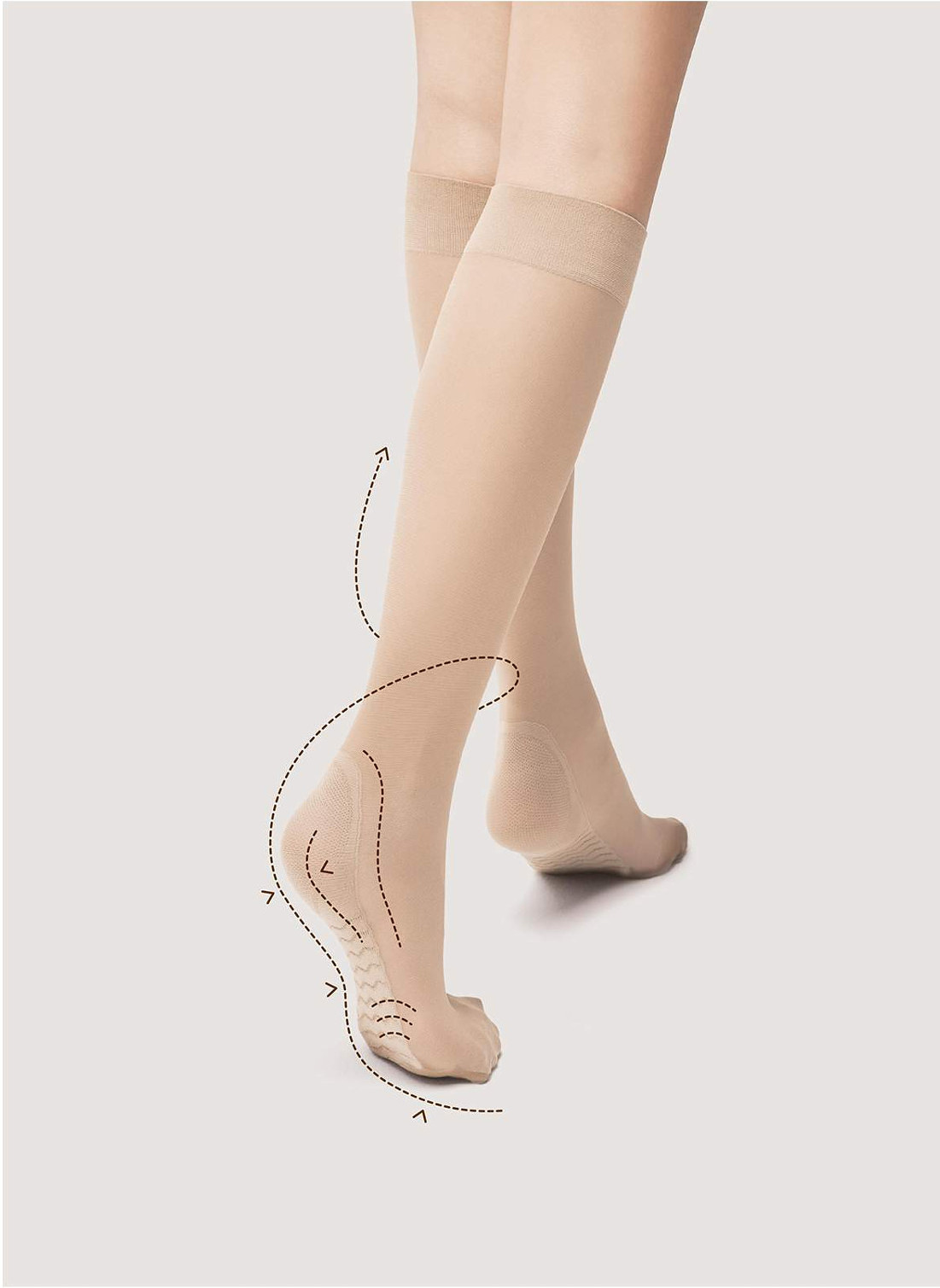 Dámské podkolenky s preventivním efektem masáže chodidel a s lemem, který netlačí. Díky využití technologie Silver Fresh zůstává kůže suchá a svěží. Proto se stávají problémy s nepříjemným množením bakterií a hub minulostí. Složení: 80 % polyamid, 20 % elastan.