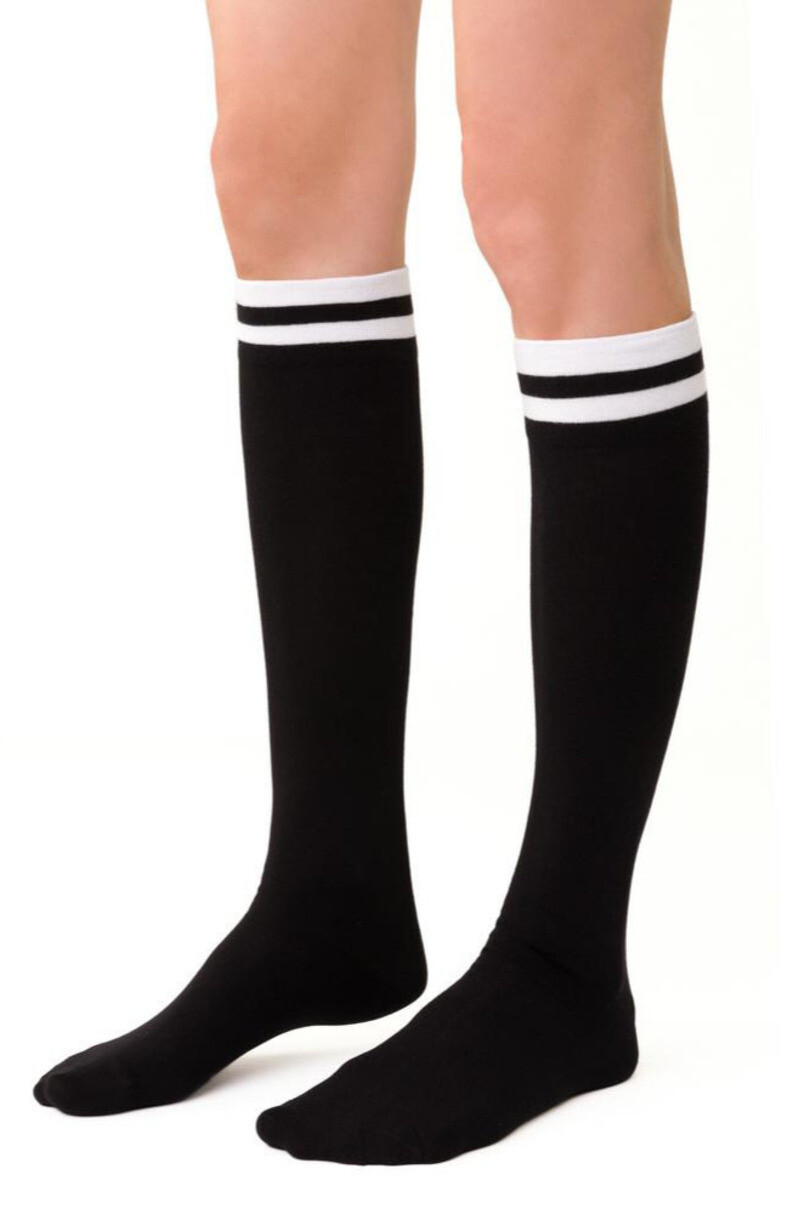 Bavlněné dámské podkolenky se vzorem, pruhy na kraji podkolenek Podkolenky jsou pohodlné a teplé a využijete je na podzim a v zimě jako zajímavý prvek mladistvých stylizací a outfitů. Model je vyrobený z velmi kvalitní bavlněné příze. Složení: 70 % bavlna, 27 % polyamid, 3 % elastan.