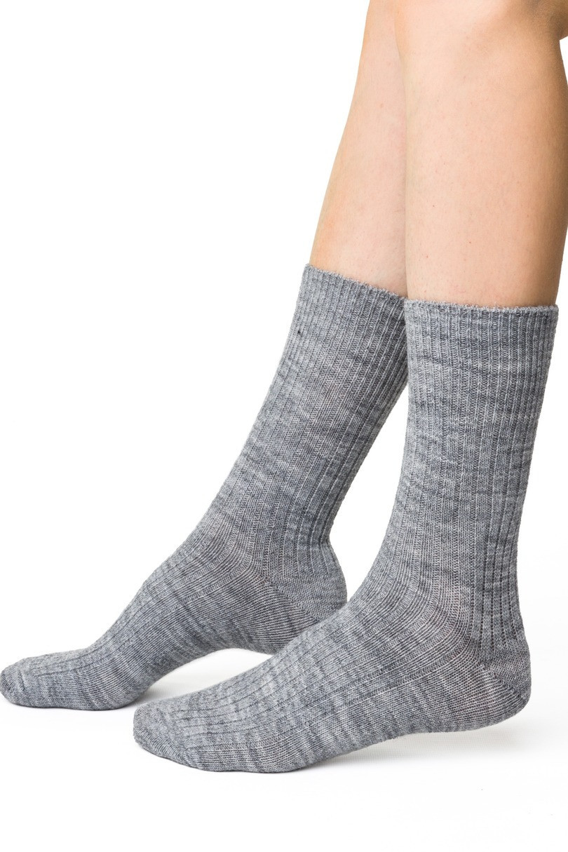 Dámské ponožky s vlnou alpaka. Vlna alpaka je třikrát pevnější než ovčí vlna, nepohlcuje zápach a má antialergické a termoizolační vlastnosti. Díky tomu jsou ponožky hedvábně měkké, nadýchané a velmi jemné. Žebrovaná struktura eliminuje zbytečný tlak na chodidlo. Ekologické papírové štítky je možné recyklovat. Složení: 56 % akryl, 22 % vlna, 11 % polyamid, 9 % alpaka, 2 % elastan.