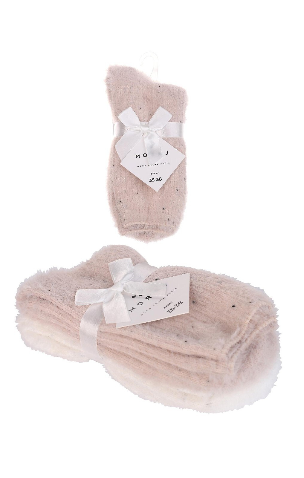 Dámské ponožky - měkký, nadýchaný úplet - hladké, jemně tečkované s "efektem pepře a soli" - pohodlný, netlačící lem - ve dvou párech, v béžové a ecru barvě - vázané saténovou mašlí - ideální nápad na dárek složení: 98 % polyester, 2 % polyamid