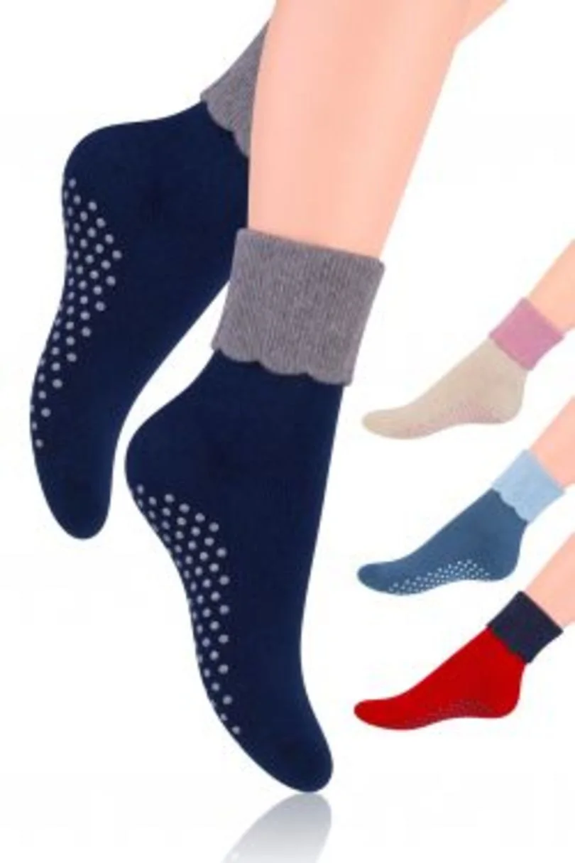 Protiskluzové dámské froté ponožky s vyhrnutým lemem. Model je vyrobený z nejkvalitnější bavlny. Ponožky jsou měkké a teplé a jsou vhodné pro chladnější dny.