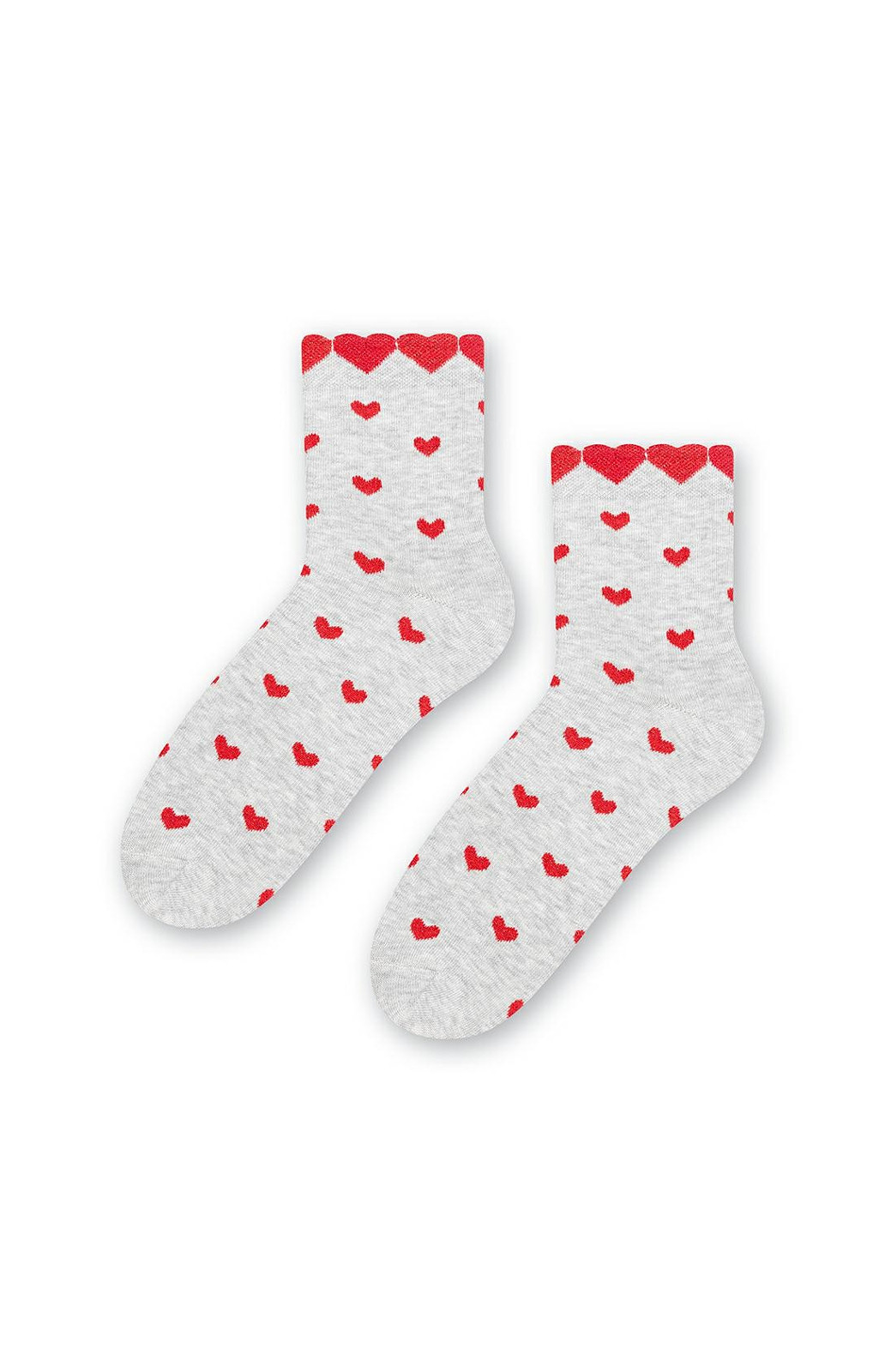 Bavlněné dámské ponožky. Ponožky jsou ozdobené valentýnskými motivy. Ploché švy a lem, který netlačí, jsou zárukou pohodlí a komfortu při nošení. Složení: 69 % bavlna, 23 % polyamid, 5 % polypropylen, 3 % elastan.