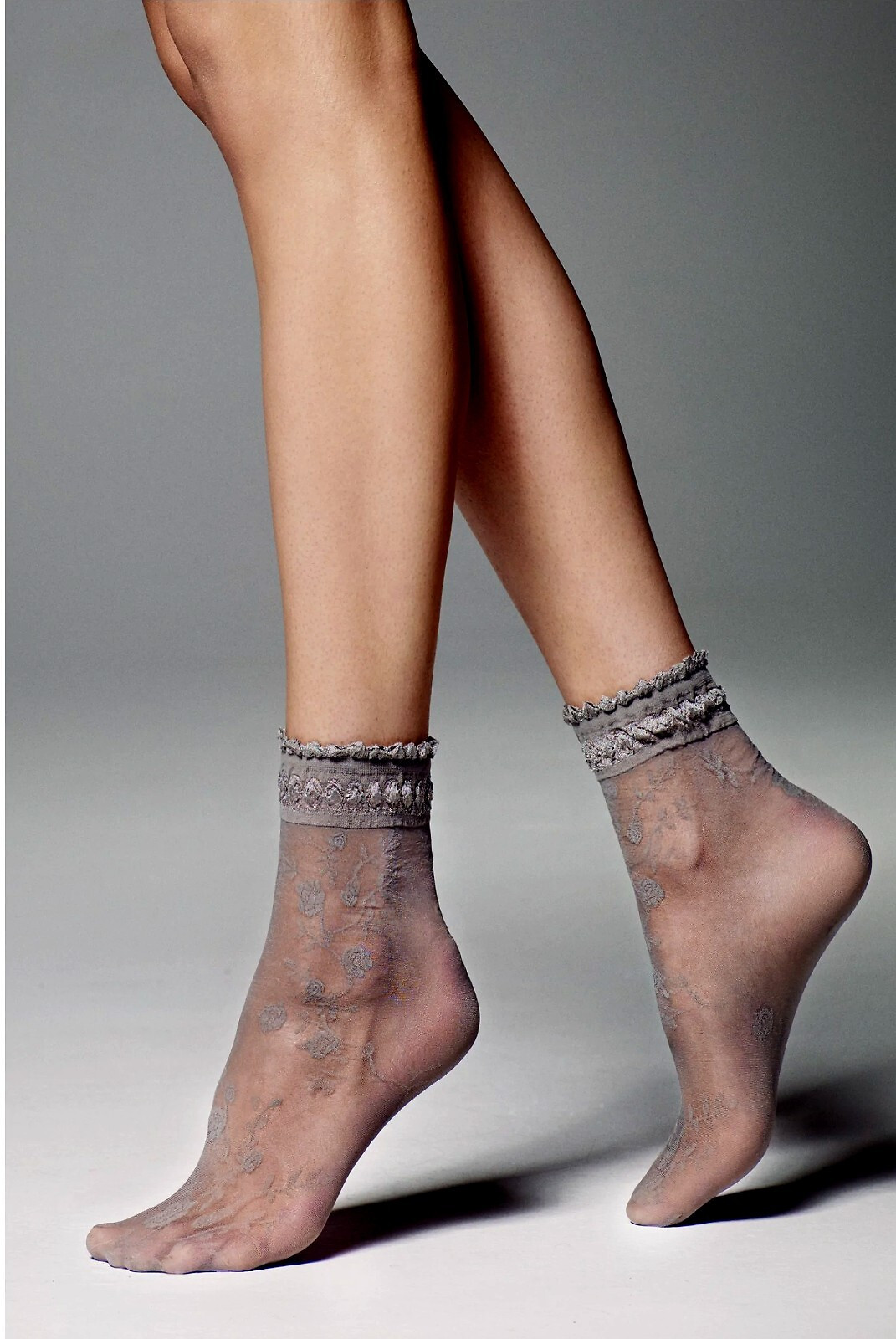 Tenké dámské ponožky, které jsou ozdobené květinovým vzorem. Model má krásně zdobený lem. Ponožky jsou vyrobené z polyamidu (88 %) a elastanu (12 %).
