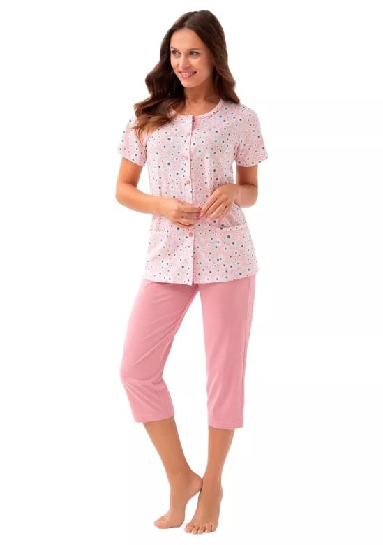 Dámské pyžamo 346/51 LUNA nabízí pohodlí a styl v jednom. Horní díl je zdoben jemným vzorem a má kulatý výstřih pro příjemný pocit kolem krku. Krátké rukávy a kabátek na rozepínání zajišťují snadné obléknutí a větrání. Praktické dvě kapsy na bocích slouží pro odložení drobností.Spodní část tvoří capri kalhoty bez kapes s širokou gumou v pase, díky které pyžamo perfektně drží a netlačí.Celé pyžamo je vyrobeno z příjemného bavlněného úpletu, který je zárukou pohodlí a prodyšnosti během noci. Složení tvoří ...