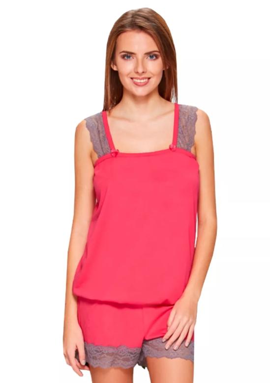 Dámské pyžamo 54/7-168/514 FABIO nabízí dokonalý komfort díky své kombinaci materiálů 50% bavlna a 50% modal, které zajišťují příjemný pocit na pokožce. Pyžamo je navrženo s kulatým výstřihem a úzkými pevnými ramínky, což vytváří elegantní a zároveň pohodlný styl. Kraťasy jsou bez kapes a ozdobené jemnou krajkou, která dodává celému modelu lehkost a ženskost.Typ: Krátké kalhotyStyl: Bez vzoru, s krajkouVlastnosti: Ramínka pevná, výstřih kulatýMateriál: Bavlna, modalUžijte si pohodlí a svěžest tohoto pyža...