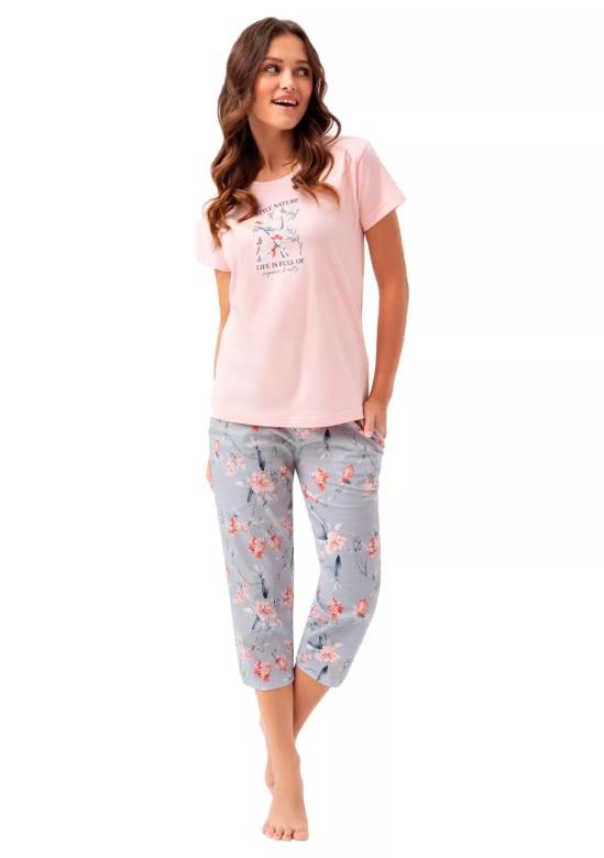 Dámské pyžamo 641/51 LUNA nabízí pohodlí a styl díky svému kulatému výstřihu a krátkým rukávům. Tričko zdobí na přední straně obrázek s nápisem STYLE NATURE, LIFE IS FULL OF organic beauty, který dodává celému modelu originální vzhled. Vzoruované capri kalhoty jsou vybaveny praktickými kapsami a širokou gumou v pase pro maximální komfort během nošení. Celé pyžamo je vyrobeno z příjemného bavlněného úpletu, což zajišťuje skvělou prodyšnost a měkkost na dotek. Složení: 100% bavlna, díky čemuž je tento kous...