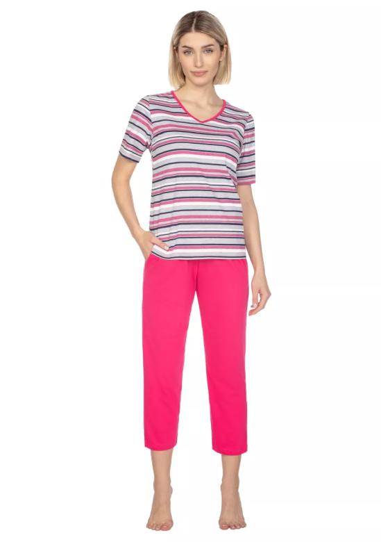 Dámské pyžamo 654/42 REGINA nabízí komfortní nošení díky příjemnému bavlněnému úpletu, který zajišťuje prodyšnost a hebkost na dotek. Tričko s véčkovým výstřihem a barevným lemem doplňuje praktický krátký rukáv, ideální pro teplejší noci. Kalhoty v délce 7/8 s kapsami přinášejí volnost pohybu a zároveň stylový vzhled se vzorem. 100% bavlna je zárukou kvality a zdravotní nezávadnosti, díky čemuž si můžete užívat dokonalý odpočinek. Toto dlouhé kalhoty pyžamo je vhodné pro všechny ženy hledající pohodlné a...