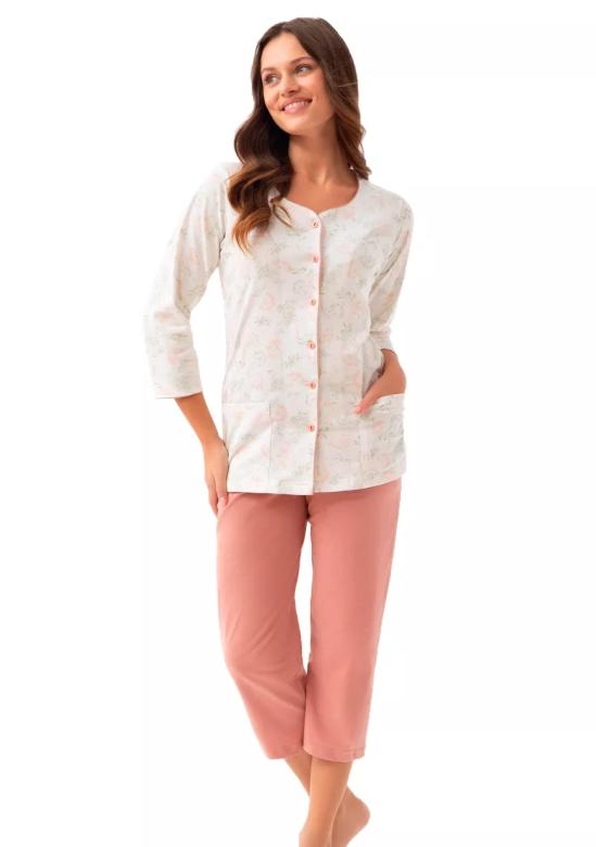 Dámské pyžamo 668/58 LUNA nabízí nejen pohodlí, ale i elegantní design. Horní díl se vyznačuje kulatým výstřihem a délkou rukávu vhodnou pro chladnější večery. Kabátek je praktický díky rozepínání na knoflíky a dvěma kapsami na bocích, což zvyšuje jeho funkčnost. Díky capri kalhotám bez kapes a široké gumičce v pase je zaručen komfort během spánku i relaxace. Celý komplet je vyroben z příjemného 100% bavlněného úpletu, který zajišťuje prodyšnost a měkkost na těle. Styl se vzorem dodává pyžamu svěží a žen...