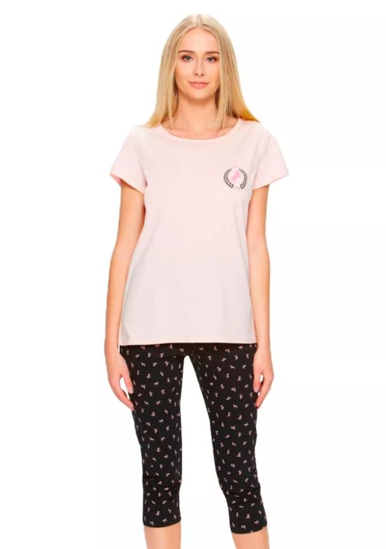 Dámské pyžamo 67/5-40M/014A773 FABIO nabízí komfort a styl v jednom. Svrchní díl pyžama je vybaven kulatým výstřihem a krátkými rukávy, které zajišťují pohodlí a volnost pohybu. Kalhoty jsou capri délky, nemají žádné kapsy a jsou ozdobeny jemným vzorem. Celý komplet je vyroben z příjemného bavlněného úpletu, který je z 100% tvořen bavlnou. Díky kvalitnímu materiálu je toto pyžamo vhodné pro každodenní nošení i pro klidný spánek.