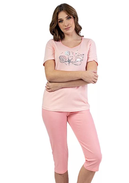 Dámské pyžamo 688/52 REGINA představuje ideální volbu pro pohodlné noční i domácí chvíle. Tričko disponuje kulatým výstřihem a krátkými rukávy, které zajišťují maximální komfort během spánku i relaxace. Na přední straně zdobí jemný obrázek, který dodává výrobku decentní styl. Capri kalhoty bez kapes dokonale padnou a jsou vyrobené z příjemného bavlněného úpletu, jenž je prodyšný a šetrný k pokožce. Materiálové složení: 100% bavlna zaručuje, že se budete cítit v pyžamu po celý večer i noc výjimečně pohodl...