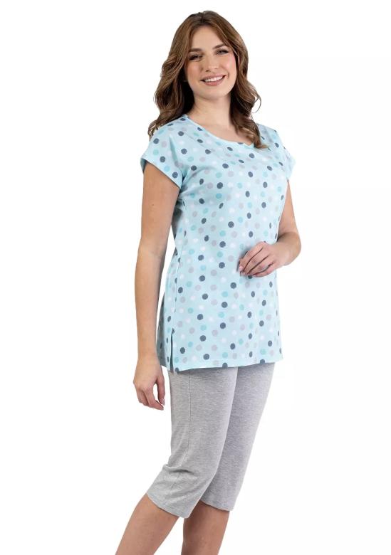 Dámské pyžamo 690/52 REGINA je ideální volbou pro ty, kteří hledají pohodlí i styl během odpočinku doma. Vrchní díl je zdoben jemným vzorem a disponuje kulatým výstřihem a krátkým rukávem, což zajistí komfort i během teplejších nocí. Boční rozparky přispívají k vyšší volnosti pohybu a příjemnému nošení. Spodní díl tvoří capri kalhoty bez kapes, které jsou dostatečně volné a pohodlné. Materiálové složení tvoří 100% bavlna, což znamená, že pyžamo je vyrobeno z příjemného bavlněného úpletu, který je šetrný...
