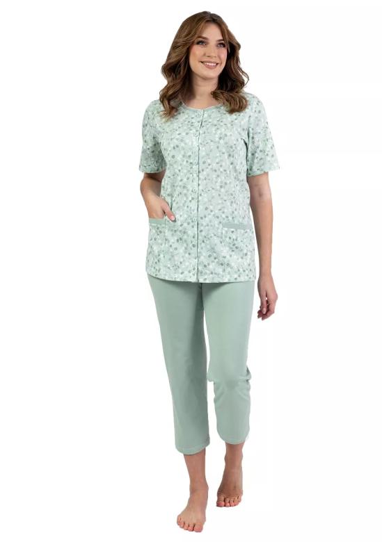 Zažijte maximální pohodlí s Dámským pyžamem 694/53 REGINA, které je navrženo pro klidné a příjemné chvíle odpočinku. Tento jemný mátově zelený komplet s decentním květinovým motivem působí svěže a elegantně. Vrchní díl s krátkými rukávy a kulatým výstřihem je doplněn funkčními knoflíky na přední straně a praktickými kapsami pro vaše drobnosti. Pyžamo působí dojmem lehkosti a zároveň spolehlivě udrží komfort během celého dne i noci. Kalhoty v capri délce, sahající pod kolena, nabízí pohodlný elastický pas...