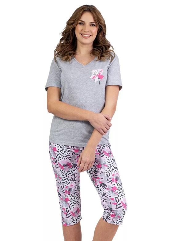 Dámské pyžamo 698/52 REGINA nabízí ideální kombinaci pohodlí a ženského stylu pro každou ženu. Horní díl je v jemné šedé barvě s krátkými rukávy a výstřihem do V, doplněný nenápadným květinovým motivem v růžových odstínech, který podtrhuje něžnost celého modelu. Spodní část tvoří capri kalhoty s originálním vzorem, který spojuje květinové a zvířecí prvky v pastelových tónech, což poskytuje moderní a svěží vzhled. Elastický pas zajišťuje pohodlné nošení během odpočinku i spánku. Typ: capri kalhoty Styl: s...