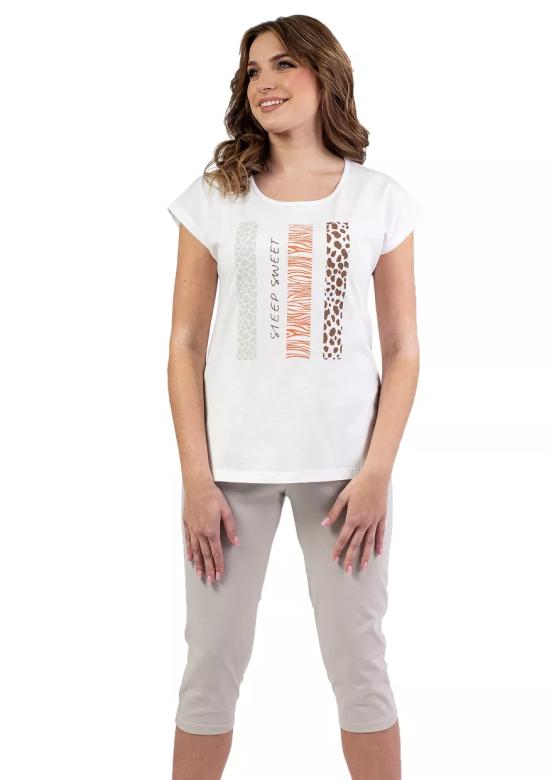 Dámské pyžamo 701/52 REGINA představuje ideální volbu pro všechny, kteří hledají pohodlí a styl při odpočinku. Tričko je zdobeno originálním potiskem s motivem a nápisem „sleep sweet“, který působí jemně a moderně. Kulatý výstřih a krátké rukávy přispívají k maximálnímu komfortu během nošení. Spodní část tvoří capri kalhoty bez kapes, které poutají pozornost svým jednoduchým střihem a praktickou délkou. Pyžamo je vyrobeno ze 100% bavlněného úpletu, což zaručuje příjemný pocit na pokožce a dostatečnou pro...