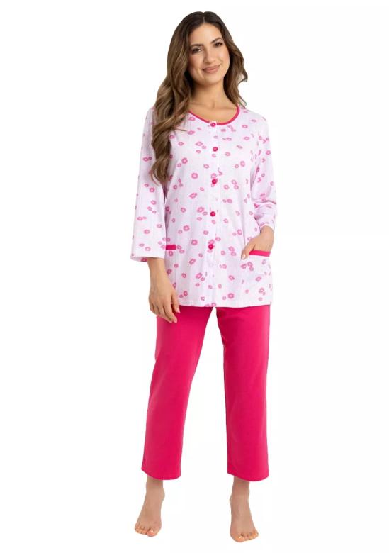 Dámské pyžamo 723/51 značky REGINA představuje dokonalou kombinaci elegance a pohodlí pro Váš domácí odpočinek. Vrchní díl s dlouhým rukávem v jemné růžové barvě je zdobený květinovým vzorem. Kulatý výstřih s kontrastním lemem ladícím k výrazně růžovým kalhotám vytváří harmonický celek, který působí žensky a stylově. Praktická kapsa na vrchním dílu přináší nejen funkčnost, ale i zajímavý detail. Kalhoty jsou rovného střihu a jejich zkrácená délka nad kotníky podtrhuje uvolněný charakter tohoto setu. Měkk...