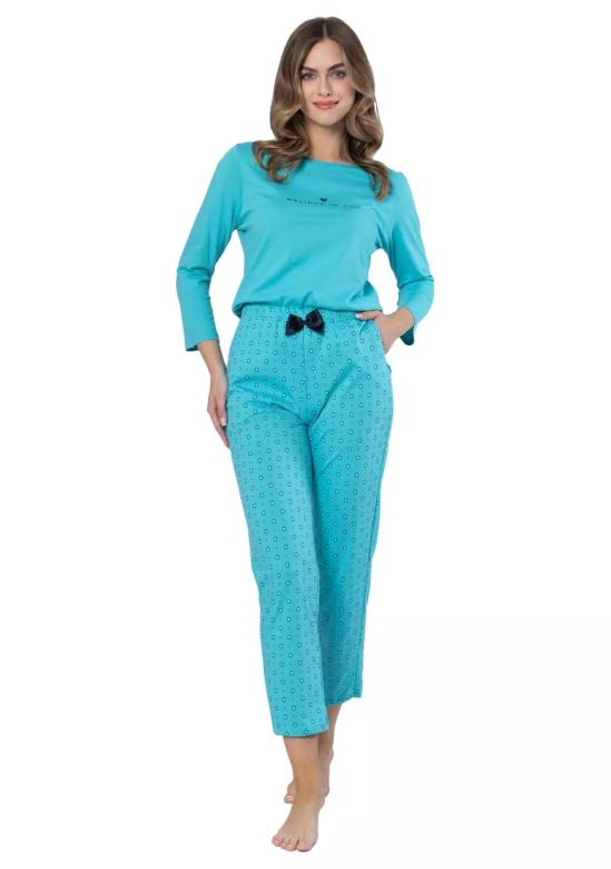 Dámské pyžamo Aldona 1649 značky LEVEZA přináší spojení elegance a pohodlí, které si zamilujete při každém večeru. Horní díl v zářivě tyrkysové barvě s kulatým výstřihem a dlouhými rukávy působí svěže a mladistvě. Přední část zdobí jemný potisk, který dodává celku hravý akcent. Spodní díl v ladícím odstínu nabízí volnější střih s rovným zakončením nohavic až ke kotníkům pro maximální komfort i během klidného spánku nebo domácího lenošení. Elastický pas se stylovou mašličkou podtrhuje ženskost a zajišťuje...