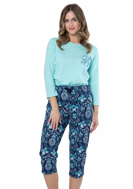 Dámské pyžamo Asteria 1651 značky LEVEZA přináší spojení elegance a pohodlí, které si zamilujete při každém večeru i domácím lenošení. Horní díl ve světle tyrkysové barvě zdobí decentní květinový motiv na hrudi, tříčtvrteční rukávy a volnější střih podporují pocit lehkosti a svobody pohybu. Kalhoty v tmavě modrém odstínu s výrazným květinovým vzorem působí svěže a mladistvě, zatímco elastický pas se stylovou mašličkou podtrhuje ženskost a zajišťuje příjemné nošení bez omezení pohybu. Materiál je tvořen v...