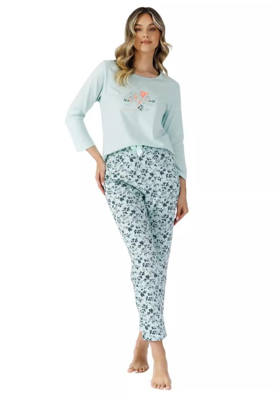 Dámské pyžamo Asyja 1480 LEVEZA nabízí pohodlí a styl v jednom. Pyžamo má kulatý výstřih a délku rukávu ideální pro chladnější noci. Horní díl je zdoben jemným obrázkem květin s nápisem „flowery dream“, což dodává decentní a ženský vzhled. Vzorem potažené dlouhé kalhoty bez kapes jsou zakončeny širokou gumou v pase pro maximální komfort při nošení. Celý komplet je vyroben z příjemného bavlněného úpletu, který zajišťuje prodyšnost a měkkost na kůži. Materiálové složení:100 % bavlnazaručuje dlouhou životno...