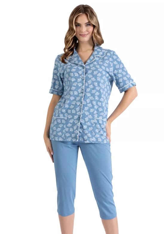 Dámské pyžamo Azalia 1450 LEVEZA představuje pohodlný a stylový kousek pro každodenní noční odpočinek. Tento set zahrnuje kabátek na rozepínání s výrazným véčkovým výstřihem a krátkými rukávy, který krásně obepíná tělo a umožňuje snadné oblékání. Součástí jsou také příjemné capri kalhoty bez kapes, s širokou gumou v pase pro maximální komfort během spánku nebo relaxace. Pyžamo je zdobeno vzorem a vyrobeno z 100% bavlny, což zajišťuje prodyšnost a hebkost materiálu, ideální pro citlivou pokožku. Vhodn...