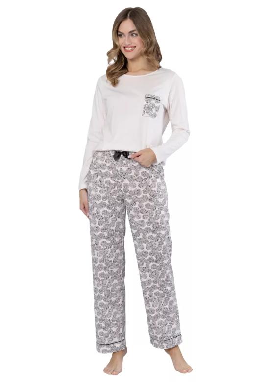 Dámské pyžamo Baska 1698 značky LEVEZA přináší dokonalou rovnováhu mezi elegancí a pohodlím. Horní díl s dlouhými rukávy v jemném světlém odstínu je doplněn dekorativní kapsičkou s kontrastním vzorem, která dodává celku osobitý šarm. Spodní díl se vyznačuje volným střihem a výrazným vzorovaným designem v tmavších tónech na světlém podkladu, což vytváří harmonický celek vhodný pro klidné večery i ničím nerušený spánek. Lehký materiál ze 100% bavlny je příjemný na dotek, prodyšný a ideální pro každodenní d...