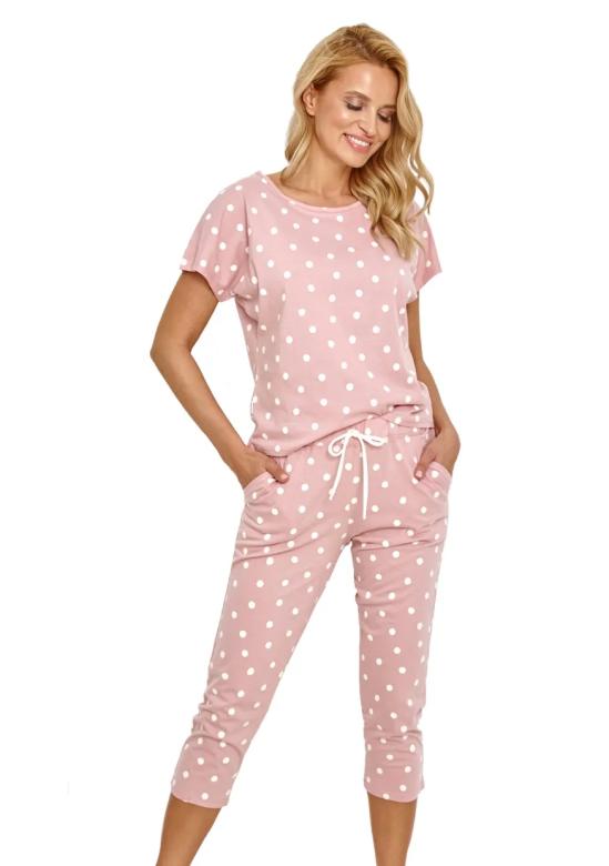 Dámské pyžamo Chloe 2860/31 TARO představuje ideální volbu pro pohodlné noční i domácí nošení. Kombinace krátkého rukávu s kulatým výstřihem zaručuje příjemný pocit a volnost pohybu během celého dne i noci. Kalhoty v designu capri jsou doplněné praktickými kapsami a šnůrkou v pase pro snadné stažení a perfektní přizpůsobení. Pyžamo je vyrobeno z 100% bavlněného úpletu, což znamená vysokou prodyšnost a měkkost na dotek. Díky vzoru s puntíky je tento model nejen pohodlný, ale i stylový – vhodný pro ženy, k...