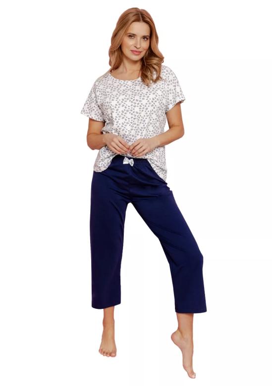 Dámské pyžamo Demi 3418 TARO je ideální volbou pro všechny ženy, které hledají pohodlí spojené s elegantním designem. Halenka s krátkým rukávem zdobená jemným květinovým vzorem v decentních šedých odstínech dodává celému modelu jemný a moderní vzhled. Horní část pyžama je navržena s kulatým výstřihem, který zajišťuje příjemné a neomezující nošení během celého dne i noci. Spodní díl tvoří jednobarevné tmavě modré dlouhé kalhoty, které jsou opatřeny elastickým pasem doplněným malou mašličkou, což přidává ...