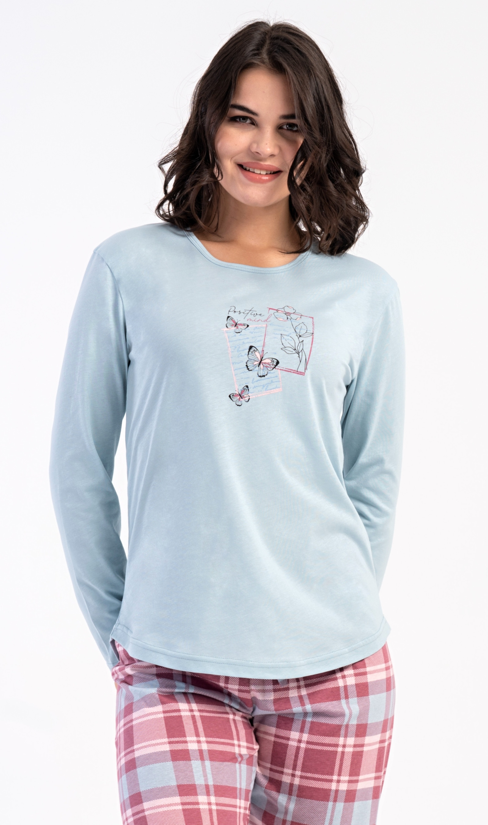 Dámské bavlněné dlouhé pyžamo Charlotte. Dámské pyžamo se skládá z trika s dlouhým rukávem a dlouhých kalhot. Jednobarevné triko s kulatým výstřihem zdobí na hrudi motýlci. Kárované kalhoty mají v pase gumu a šňůrku na stažení, nemají kapsy. Použitý bavlněný materiál je poddajný a příjemný na dotek. Pokyny pro údržbu:- 100% bavlna- lze prát v pračce při teplotě do 30°- nesušit v sušičce- žehlit z rubu do 110°- nepoužívat bělící prostředky- nečistit chemickyMíry naměřené na výrobku 5031093825 CharlotteSML...