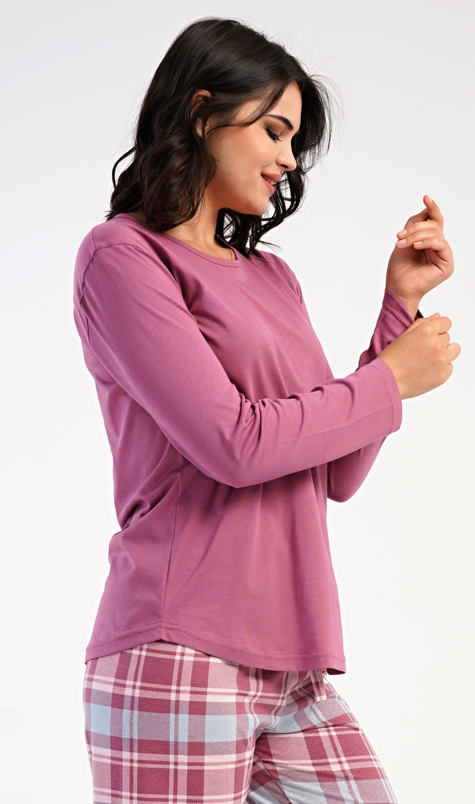 Dámské bavlněné dlouhé pyžamo Dominica. Dámské pyžamo se skládá z trika s dlouhým rukávem a dlouhých kalhot. Triko je jednobarevné, bez potisku, má kulatý výstřih. Kárované kalhoty mají v pase gumu a šňůrku na stažení, nemají kapsy. Použitý bavlněný materiál je poddajný a příjemný na dotek. Pokyny pro údržbu:-100 % bavlna- lze prát v pračce při teplotě do 30°- nesušit v sušičce- žehlit z rubu do 110°- nepoužívat bělící prostředky- nečistit chemickyMíry naměřené na výrobku: 5050053827 DominicaSMLXLobvod h...