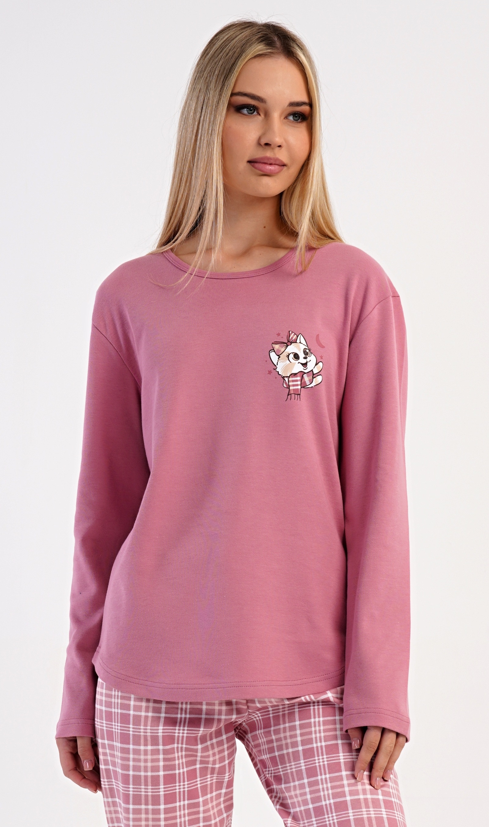 Dámské bavlněné dlouhé pyžamo Kotě se šálou. Dámské pyžamo se skládá z trika s dlouhým rukávem a dlouhých kalhot. Jednobarevné triko s kulatým výstřihem zdobí na hrudi drobný obrázek kočky. Kárované kalhoty mají v pase gumu a šňůrku na stažení, nemají kapsy. Použitý bavlněný materiál je poddajný a příjemný na dotek. Pokyny pro údržbu: - 100% bavlna- lze prát v pračce při teplotě do 30°- nesušit v sušičce- žehlit z rubu do 110°- nepoužívat bělící prostředky- nečistit chemicky Míry naměřené na výrobku ...