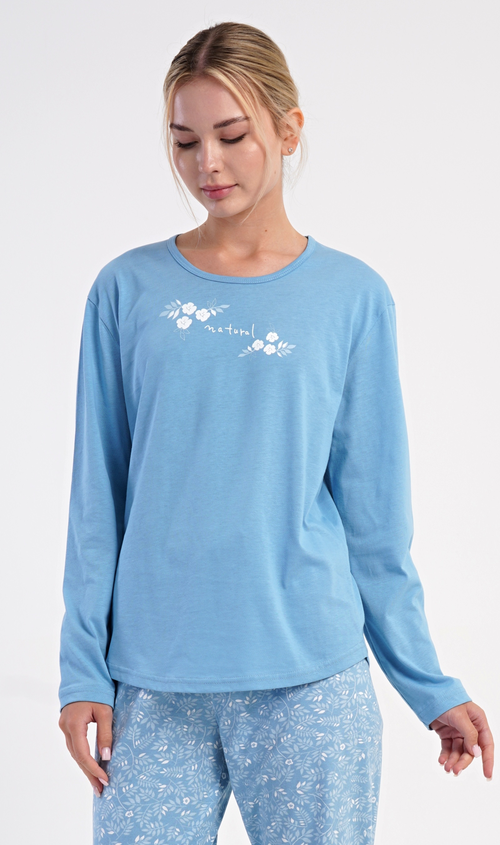 Dámské bavlněné dlouhé pyžamo Natural life. Dámské pyžamo se skládá z trika s dlouhým rukávem a dlouhých kalhot. Jednobarevné triko je ozdobeno obrázkem květů a větviček. Tento motiv se opakuje i na kalhotách, které mají v pase gumu a šňůrku na stažení, nemají kapsy. Použitý bavlněný materiál je poddajný a příjemný na dotek. Pokyny pro údržbu:- 100% bavlna- lze prát v pračce při teplotě do 30°- nesušit v sušičce- žehlit z rubu do 110°- nepoužívat bělící prostředky- nečistit chemickyMíry naměřené na výrob...