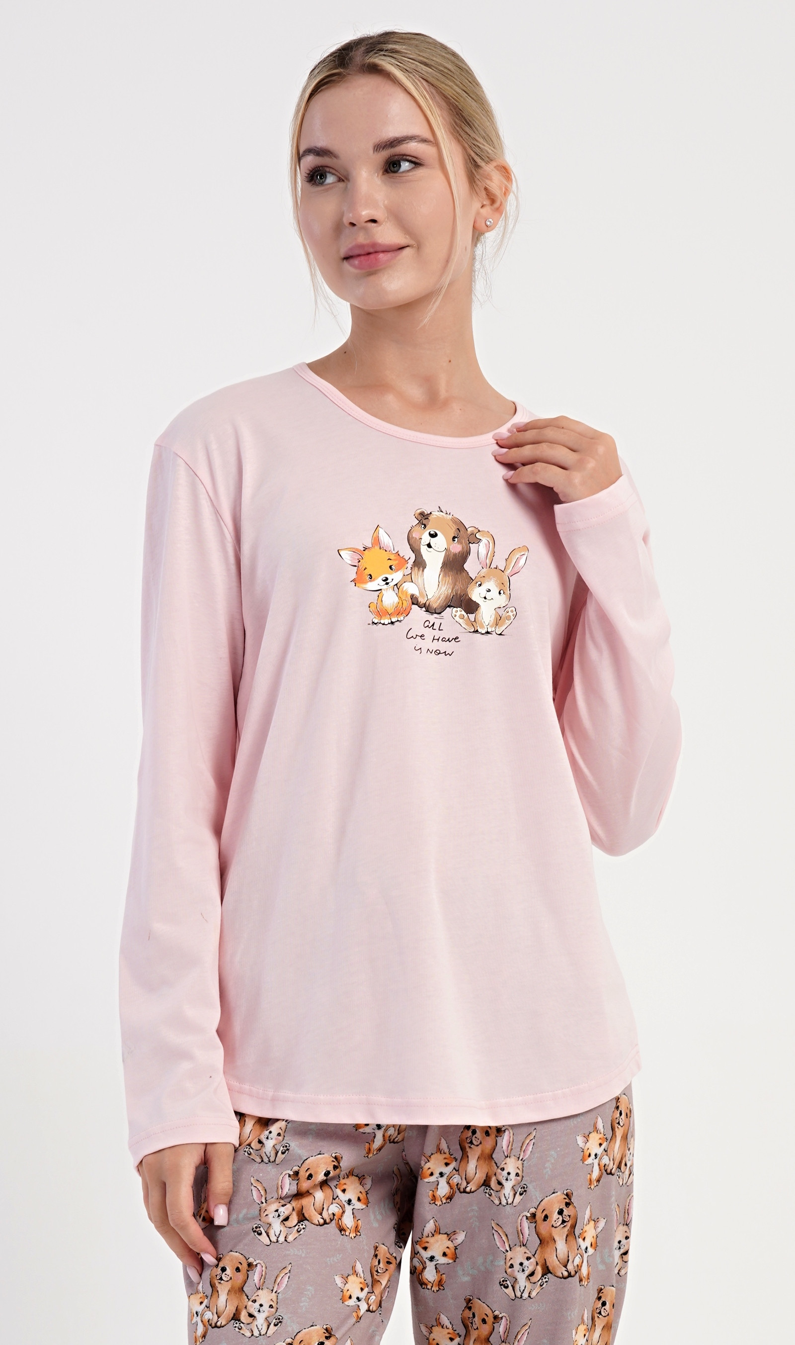 Dámské bavlněné dlouhé pyžamo Olivia. Dámské pyžamo se skládá z trika s dlouhým rukávem a dlouhých kalhot. Jednobarevné triko zdobí na hrudi obrázek malé lišky, štěněte a králíčka. Tento motiv se opakuje i na kalhotách, které mají v pase gumu a šňůrku na stažení, nemají kapsy. Použitý bavlněný materiál je poddajný a příjemný na dotek. Pokyny pro údržbu:-100 % bavlna- lze prát v pračce při teplotě do 30°- nesušit v sušičce- žehlit z rubu do 110°- nepoužívat bělící prostředky- nečistit chemickyMíry naměřen...