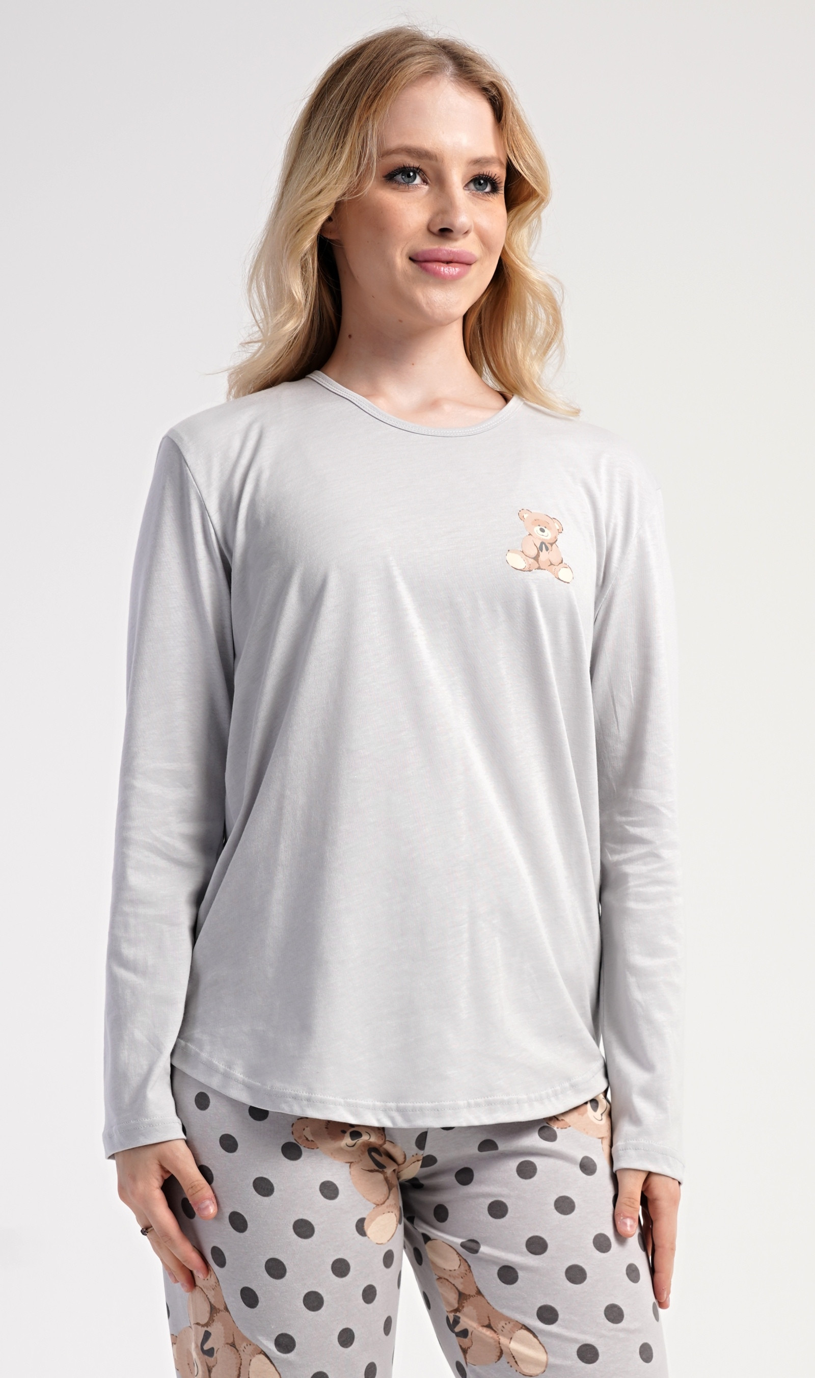 Dámské bavlněné dlouhé pyžamo Poppy. Dámské pyžamo se skládá z trika s dlouhým rukávem a dlouhých kalhot. Jednobarevné triko s kulatým výstřihem je ozdobeno obrázkem medvídka. Tento motiv se opakuje i na kalhotách, které mají v pase gumu a šňůrku na stažení, nemají kapsy. Použitý bavlněný materiál je poddajný a příjemný na dotek. Pokyny pro údržbu:- 100% bavlna- lze prát v pračce při teplotě do 30°- nesušit v sušičce- žehlit z rubu do 110°- nepoužívat bělící prostředky- nečistit chemickyMíry naměřené na ...