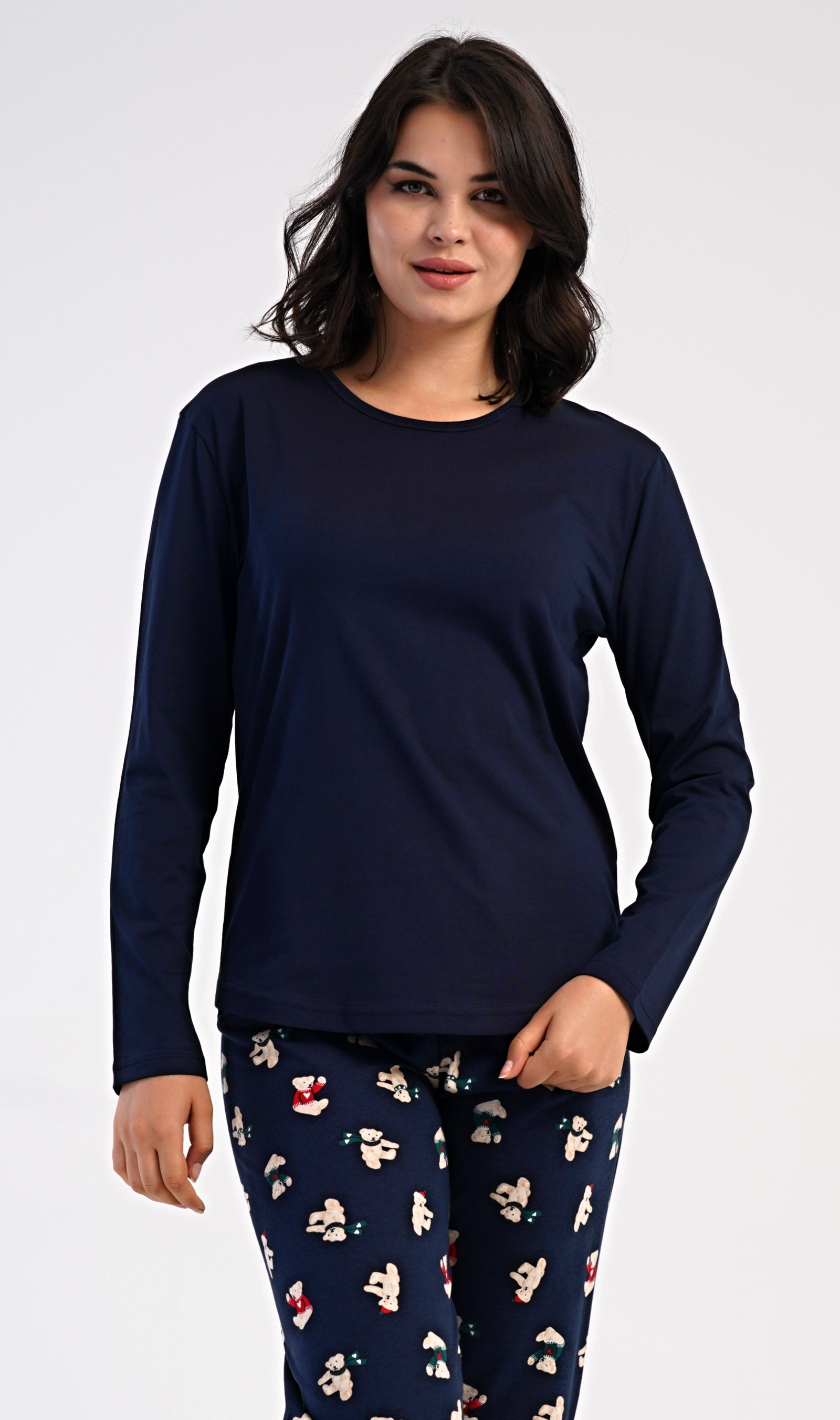 Dámské bavlněné dlouhé pyžamo Sabrina. Dámské pyžamo se skládá z trika s dlouhým rukávem a dlouhých kalhot. Triko je jednobarevné, bez potisku, má kulatý výstřih. Kalhoty s potiskem medvídků mají v pase gumu a šňůrku na stažení, nemají kapsy. Použitý bavlněný materiál je poddajný a příjemný na dotek.