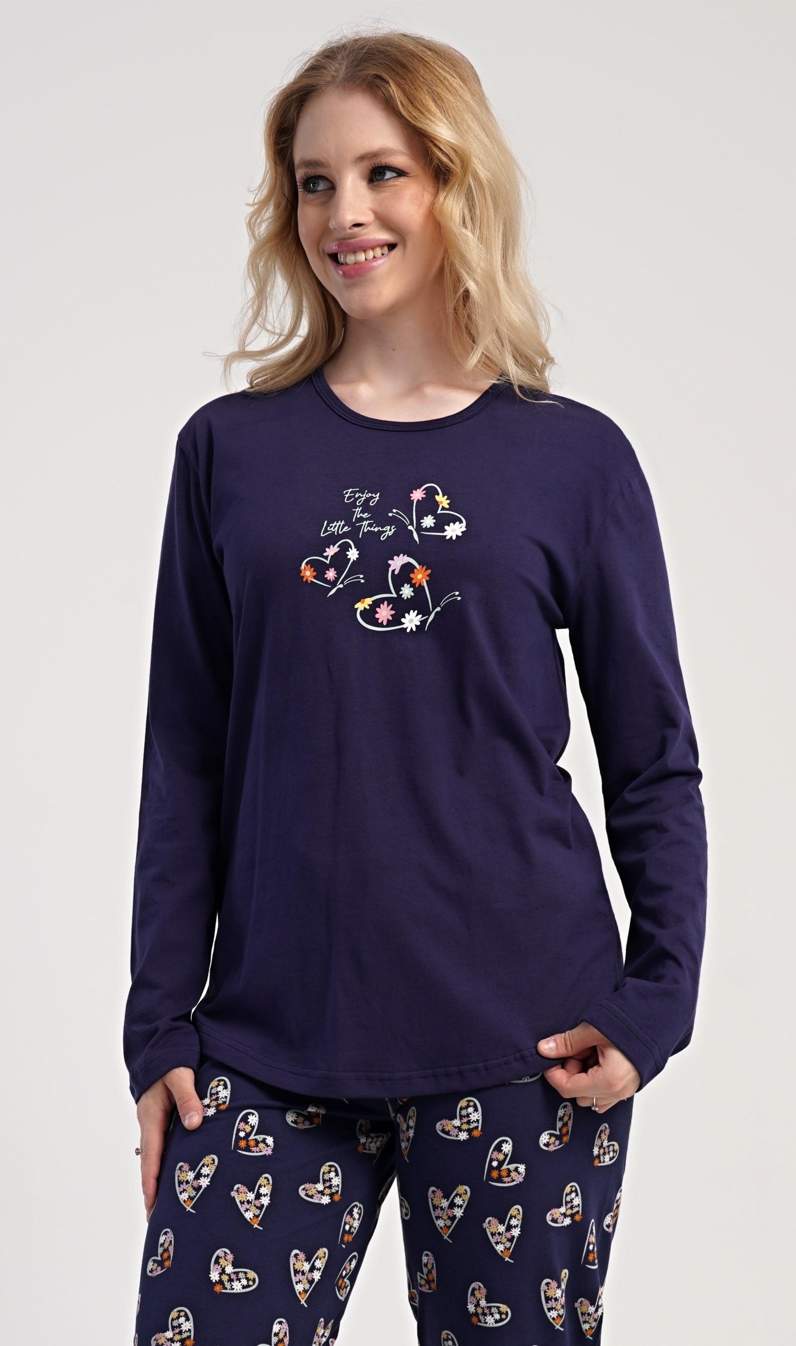 Dámské bavlněné dlouhé pyžamo Sarah. Dámské pyžamo se skládá z trika s dlouhým rukávem a dlouhých kalhot. Jednobarevné triko je ozdobeno obrázkem květů a motýlů. Květinový motiv se opakuje i na kalhotách, které mají v pase gumu a šňůrku na stažení, nemají kapsy. Použitý bavlněný materiál je poddajný a příjemný na dotek. Pokyny pro údržbu:- 100% bavlna- lze prát v pračce při teplotě do 30°- nesušit v sušičce- žehlit z rubu do 110°- nepoužívat bělící prostředky- nečistit chemickyMíry naměřené na výrobku: 5...