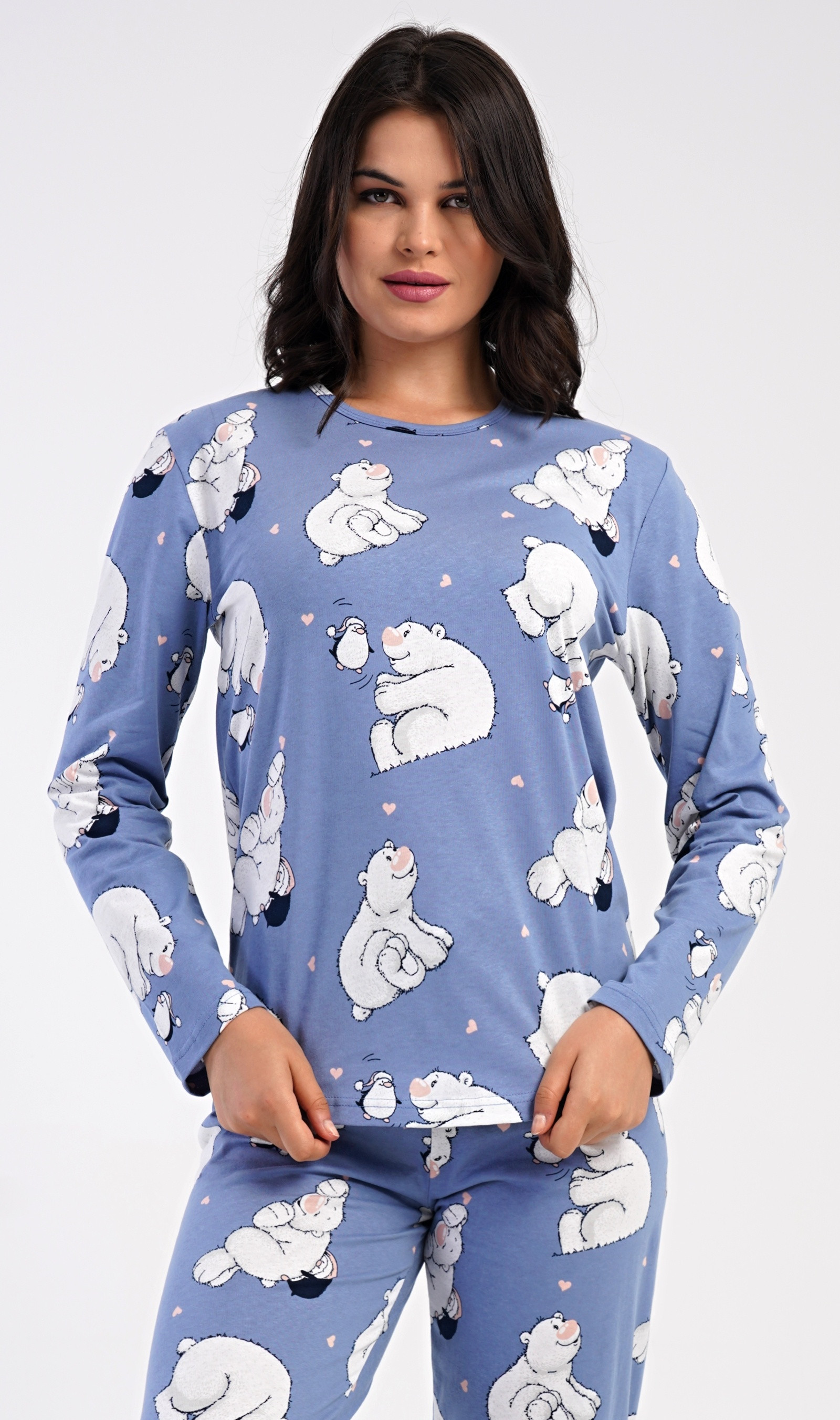 Dámské bavlněné dlouhé pyžamo Tučňák a méďa. Dámské pyžamo se skládá z trika s dlouhým rukávem a dlouhých kalhot. Triko s kulatým výstřihem je ozdobeno obrázky ledních medvědů. Tento motiv se opakuje i na kalhotách, které mají v pase gumu a šňůrku na stažení, nemají kapsy. Použitý bavlněný materiál je poddajný a příjemný na dotek. Pokyny pro údržbu:- 100% bavlna- lze prát v pračce při teplotě do 30°- nesušit v sušičce- žehlit z rubu do 110°- nepoužívat bělící prostředky- nečistit chemicky 5040381122 Tučň...
