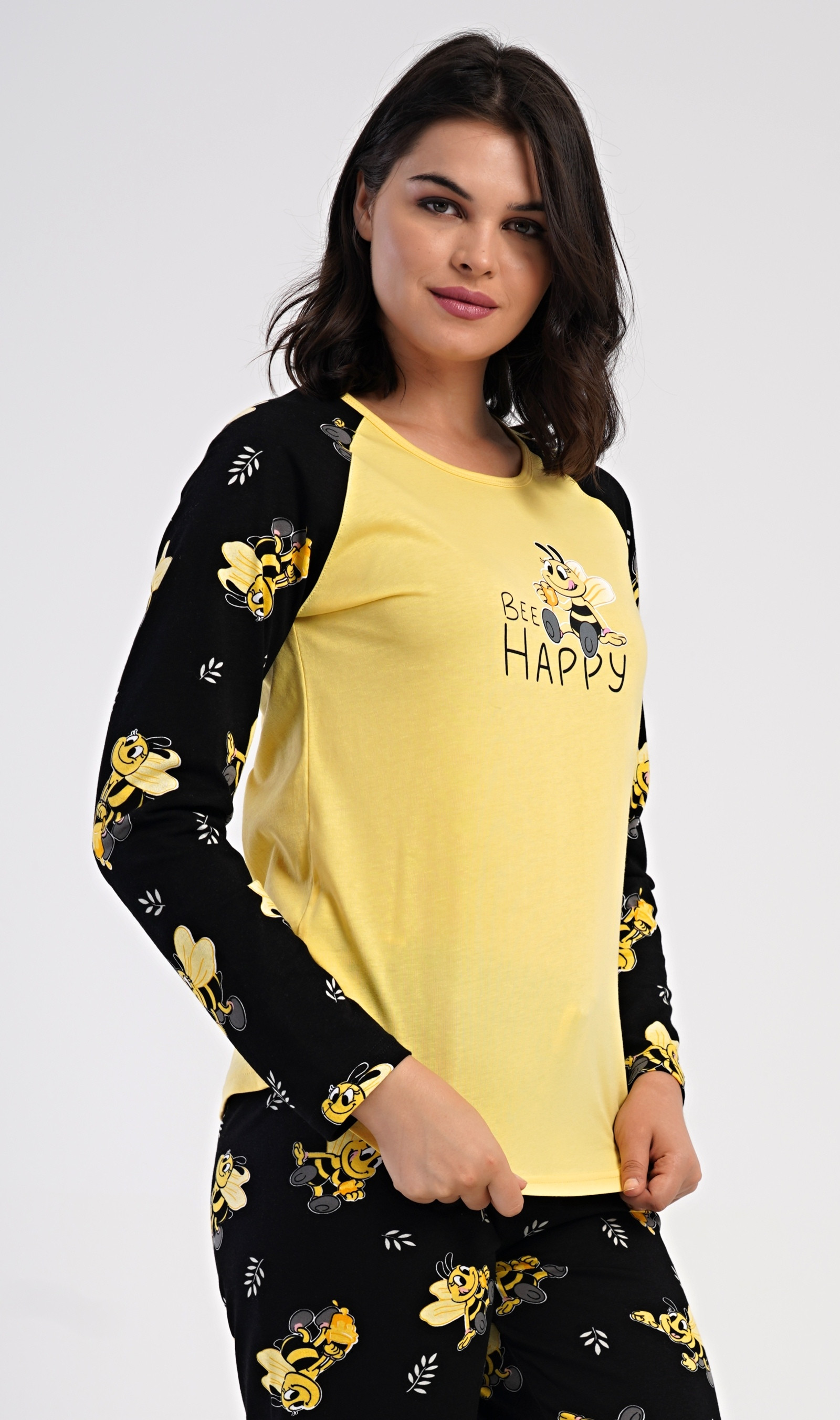 Dámské bavlněné dlouhé pyžamo Včelka. Dámské pyžamo se skládá z trika s dlouhým rukávem a dlouhých kalhot. Triko s kulatým výstřihem je na hrudi zdobeno obrázkem včelky. Tento motiv se opakuje i na kalhotách, které mají v pase gumu a šňůrku na stažení, nemají kapsy. Použitý bavlněný materiál je poddajný a příjemný na dotek. Pokyny pro údržbu:- 100% bavlna- lze prát v pračce při teplotě do 30°- nesušit v sušičce- žehlit z rubu do 110°- nepoužívat bělící prostředky- nečistit chemickyMíry naměřené na výrobk...