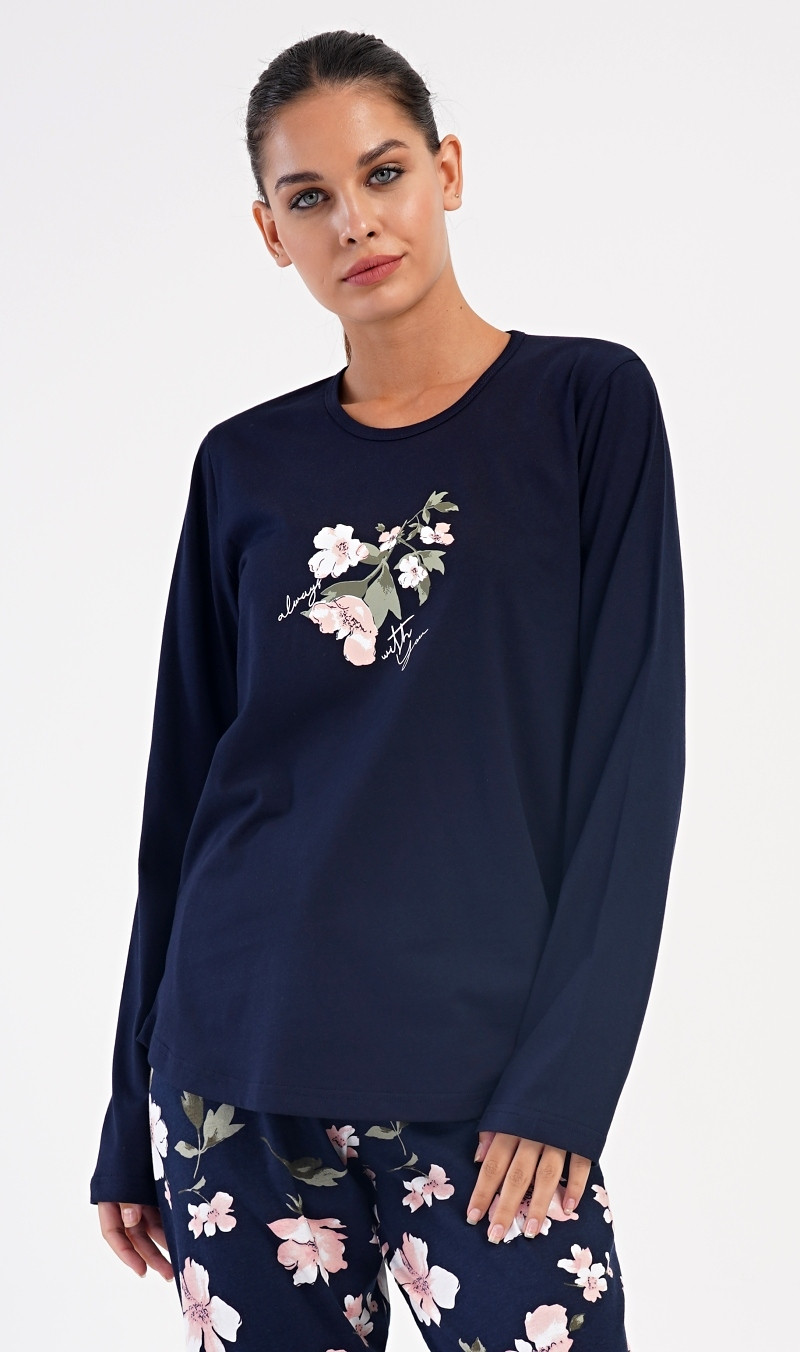 Dámské bavlněné dlouhé pyžamo značky Vienetta Secret. Dámské pyžamo se skládá z trika s dlouhým rukávem a dlouhých kalhot. Triko je jednobarevné, zdobené obrázkem květu a drobným nápisem. Květinový potisk se opakuje i na kalhotách, které mají v pase gumu a šňůrku na stažení, nemají kapsy. Použitý bavlněný materiál je poddajný a příjemný na dotek.