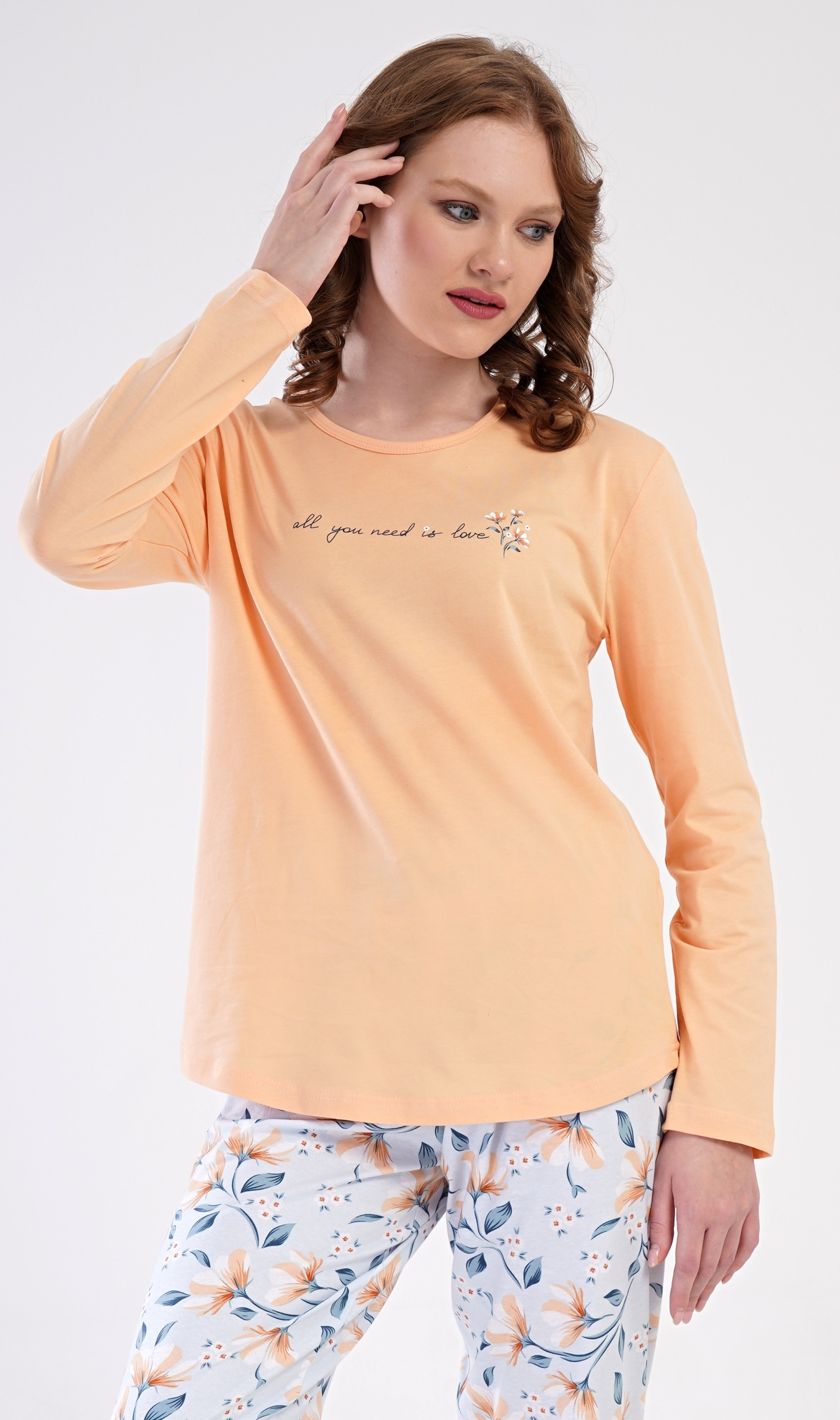 Jemné dámské pyžamo s dlouhým rukávem Karolína. Pyžamo má triko s dlouhým rukávem a jemným motivem. Materiál 100% bavlna