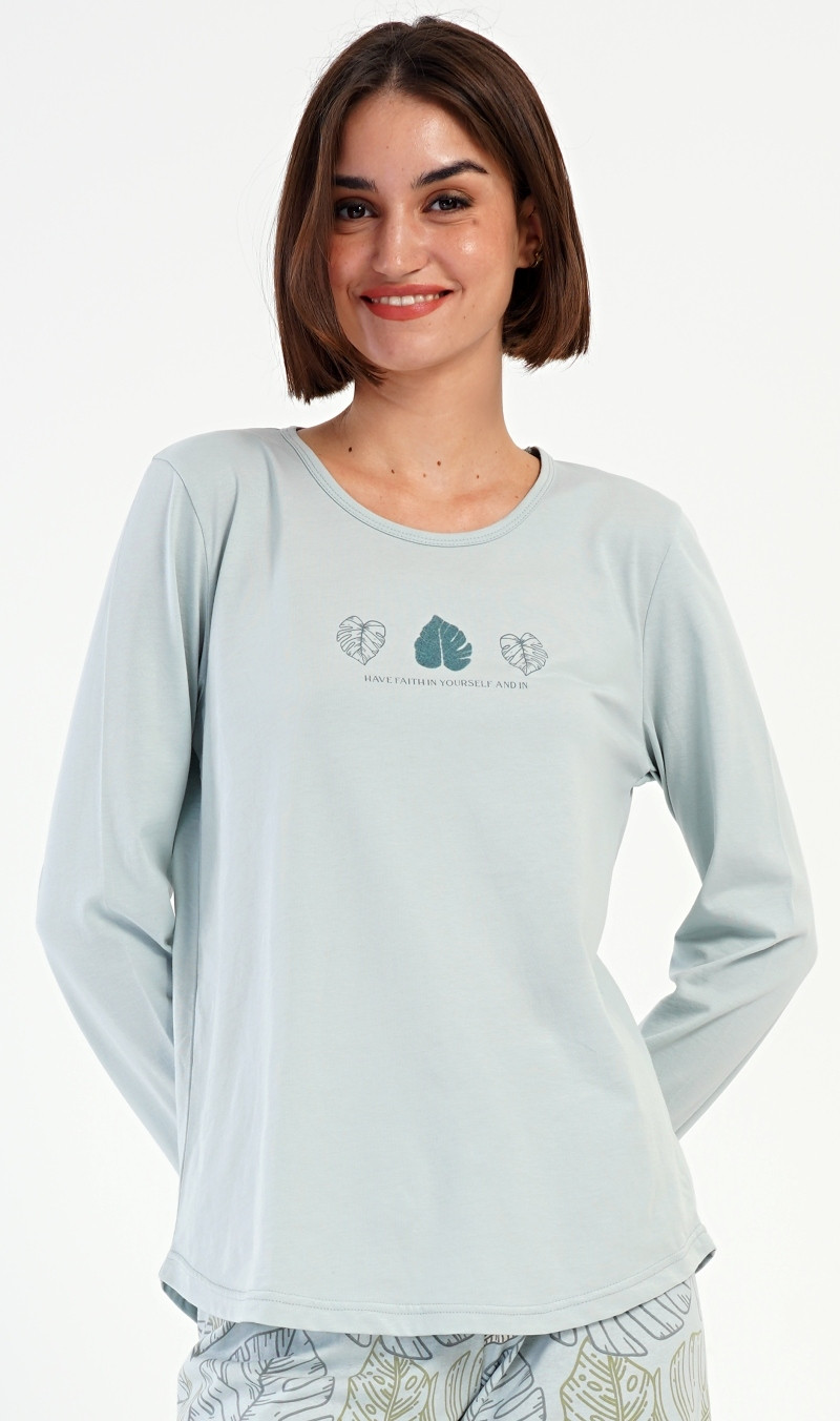 Dámské bavlněné dlouhé pyžamo Vienetta Secret. Dámské pyžamo se skládá z trika s dlouhým rukávem a dlouhých kalhot. Triko je jednobarevné, zdobené obrázkem listů a drobným nápisem. Motiv listů se opakuje i na kalhotách, které mají v pase gumu a šňůrku na stažení, nemají kapsy. Použitý bavlněný materiál je poddajný a příjemný na dotek.