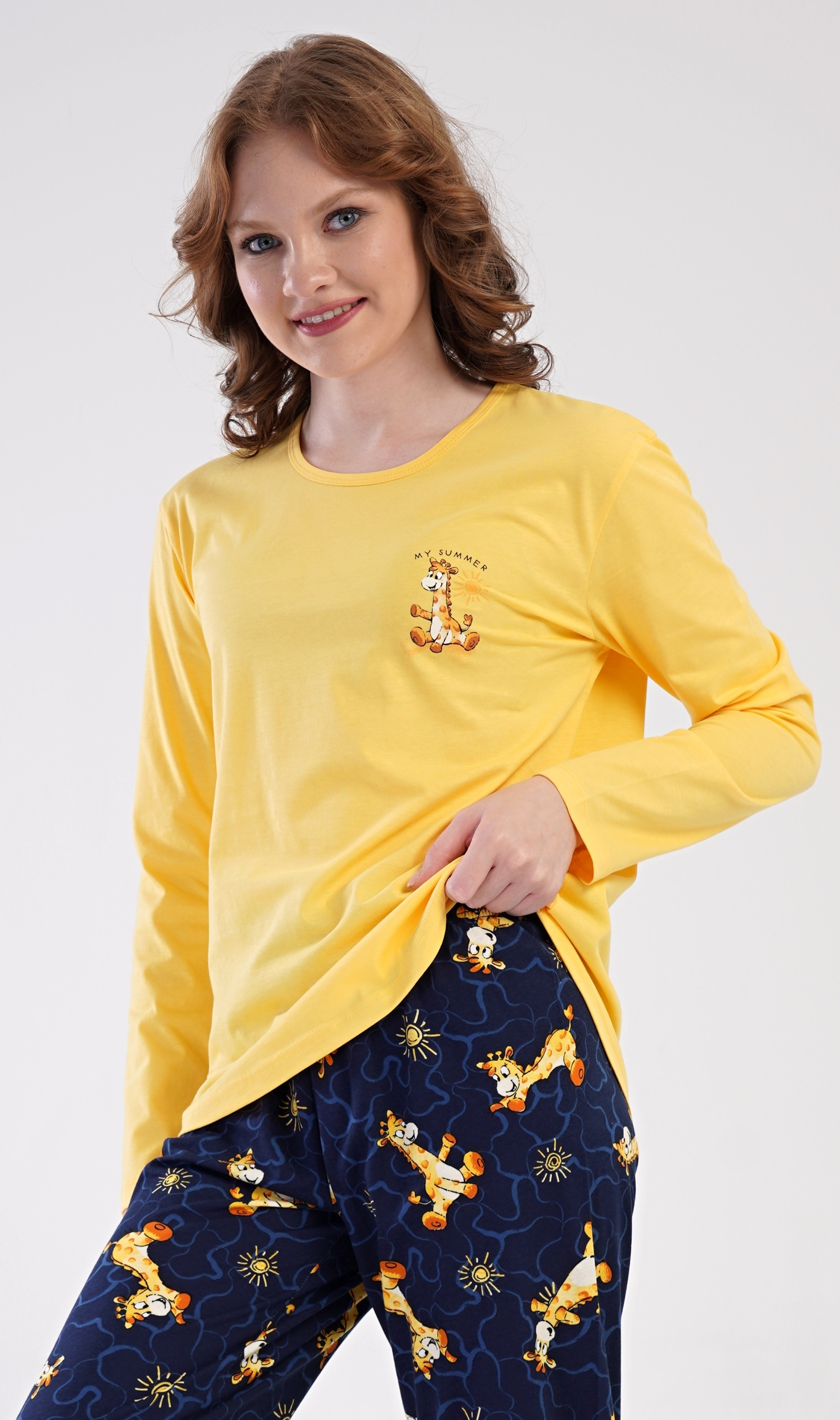 Veselé dámské pyžamo s dlouhým rukávem a motivem žiraf. Materiál 100% bavlna
