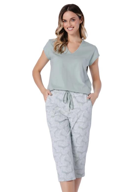 Dámské pyžamo Eleonora 1727 značky LEVEZA je ideální volbou pro ženy, které hledají spojení elegance a pohodlí. Horní díl s krátkým rukávem a véčkovým výstřihem působí jemně a lichotivě, zatímco měkký materiál v decentní zelené barvě přináší pocit svěžesti i během teplých nocí. Spodní část tvoří capri kalhoty, jejichž volný střih s elastickým pasem na šňůrku zaručuje maximální komfort při nošení. Světlý odstín kalhot doplňuje nenápadný vzor, který dodává celému kompletu stylový vzhled bez zbytečné okázal...
