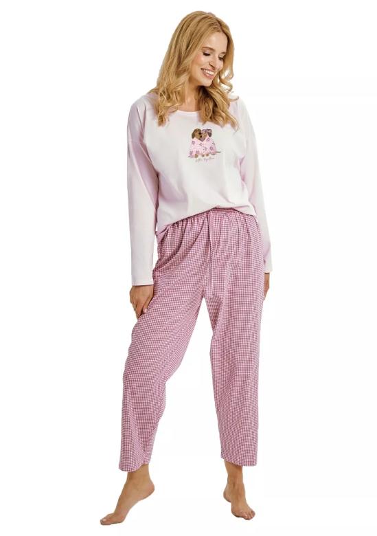 Dámské pyžamo Elisa 3434 značky TARO přináší do Vašeho večerního rituálu harmonii pohodlí a jemné elegance. Horní díl v něžném pastelově růžovém odstínu zdobí hravý obrázek, který navozuje radostnou atmosféru a podtrhuje osobitý styl. Volný střih s dlouhými rukávy příjemně obepíná tělo, aniž by omezoval pohyb během spánku či odpočinku. Spodní díl tvoří volné kalhoty s moderním kostkovaným vzorem v růžovo-bílých tónech, doplněné pružným pasem pro maximální komfort po celý den i noc. Lehký materiál z čisté...