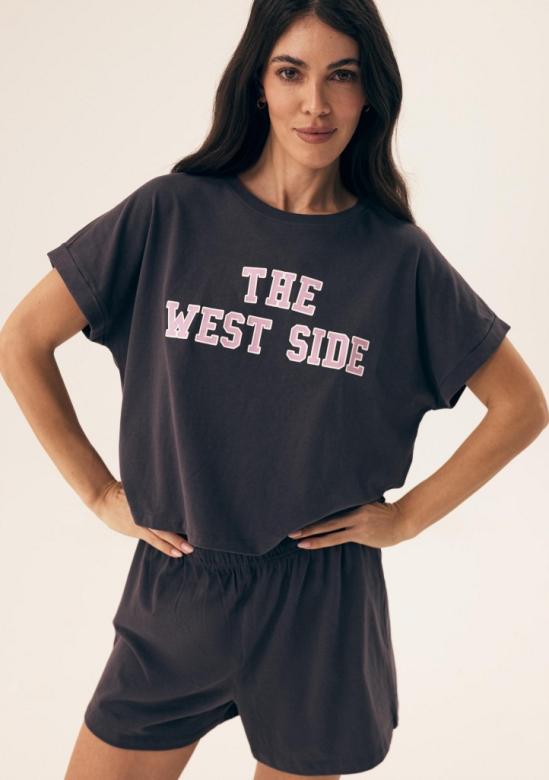 Dámské pyžamo od značky Esotiq v nadčasovém stylu pro všechny, kdo zakládají na každodenním pohodlí. Pyžamo se skládá z kratšího trička a šortek, které spolu tvoří pohodlný a stylový komplet ideální na spaní i domácí pohodu. Tričko s krátkým rukávem má na přední straně pogumovaný nápis, šortky jsou v pase na pohodlnou pružnou gumu. Díky bavlněnému materiálu je pyžamo velmi měkké a příjemné na dotek. Materiálové složení: 100 % bavlna.