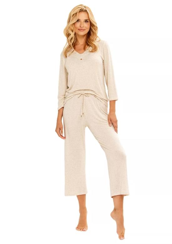 Dámské pyžamo Haria 3245/41 TARO nabízí maximální pohodlí díky svému kvalitnímu materiálu a promyšlenému designu. Pyžamo je vyrobeno ze 75% viskózy, 20% lnu a 5% elastanu, což zaručuje příjemný a lehký úplet, který je šetrný k pokožce. Dlouhé kalhoty bez kapes jsou vybaveny šňůrkou ke stažení v pase, která zajišťuje perfektní přilnutí bez omezení pohybu. Horní díl pyžama se pyšní véčkovým výstřihem a dlouhým rukávem, navíc zdobeným malým ozdobným prvkem pro elegantní vzhled. Styl pyžama je minimalistic...