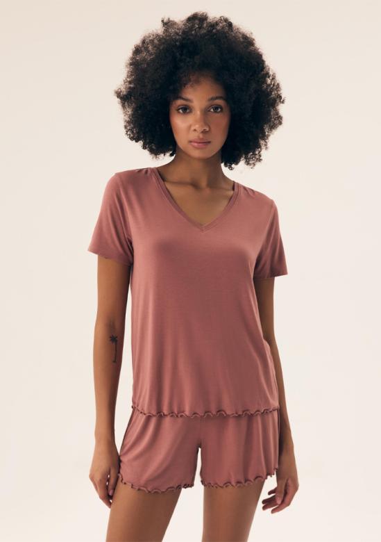 Starorůžové pyžamo Henderson vyniká svou jemnou barvou a ženským stylem. Sada obsahuje volné tričko s krátkým rukávem a pohodlné šortky, které zdobí jemné řasení. Měkký materiál vám dopřeje maximální komfort a pocit lehkosti po celou noc. Stylové a praktické pyžamo, které zpříjemní vaše chvíle odpočinku i spánku. Materiálové složení: 95% viskóza, 5% elastan.