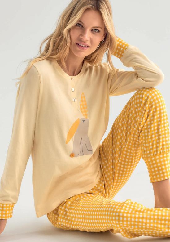 Veselé dámské pyžamo Infiore, které vás rozzáří svým hravým designem. Horní díl v jemné žluté barvě zdobí originální potisk zajíčka a praktické zapínání na knoflíčky u krku. Dlouhé kalhoty s ikonickým kostkovaným vzorem v teplých tónech žluté a bílé se postarají o maximální pohodlí během spánku i lenošení doma. Pyžamo je ušité z měkkého a prodyšného materiálu, který vám zajistí příjemný pocit po celou noc. Dopřejte si klidné a veselé sny s tímto roztomilým kompletem! Materiálové složení: 100% bavlna.