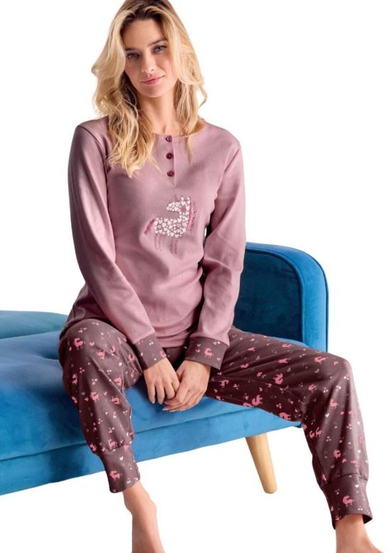 Dámské bavlněné pyžamo italské značky Infiore. Pyžamo je ze 100% bavlny, je velmi příjemé a pohodlné. Vrchní díl má kulatý výstřih a légu se třemi knoflíky. Rukávy a spodní díl jsou ukončené úplety. Na přední straně je natištěná a vyšitá aplikace. Vzorované kalhoty jsou do pružné pohodlné gumy. Materiálové složení: 100% bavlna