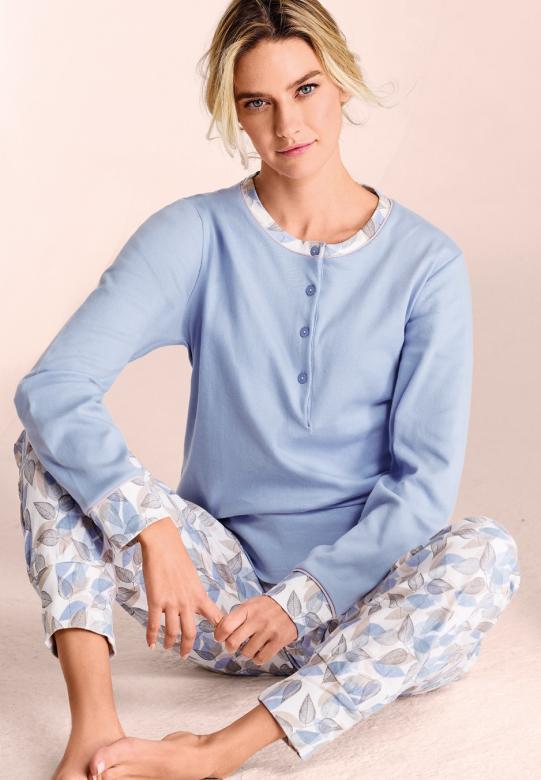 Dámské bavlněné pyžamo italské značky Infiore. Pyžamo je ze 100% bavlny, je velmi příjemé a pohodlné. Vrchní díl má kulatý výstřih a légu se čtyřmi knoflíky. Rukávy a spodní díl jsou ukončené úplety. Vzorované kalhoty jsou do pružné pohodlné gumy. Materiálové složení: 100% bavlna