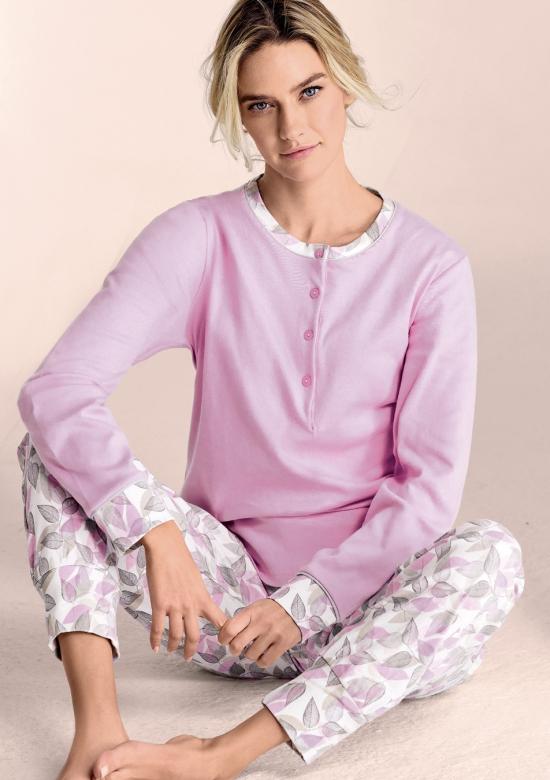 Dámské bavlněné pyžamo italské značky Infiore. Pyžamo je ze 100% bavlny, je velmi příjemé a pohodlné. Vrchní díl má kulatý výstřih a légu se čtyřmi knoflíky. Rukávy a spodní díl jsou ukončené úplety. Vzorované kalhoty jsou do pružné pohodlné gumy. Materiálové složení: 100% bavlna